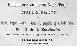 In 1874 this company merged with Otto Schwarts Eftf.s Boghandel (founded 1865) and Em. Bærentzen & Co. (founded 1838, owned by Jens Peter Trap) under the name Hoffensberg, Jespersen & Trap. The book printing business G. S. Eibes Bogtrykkeri (founded 1859) was also part of the merger. In 1875, Hoffensberg, Jespersen & Trap purchased the former Waisen House at Købmagergade 44.