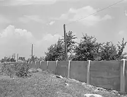 Due to redlining, the Eight Mile area was extremely poor and was considered a "blighted area".[4] After World War II, a developer saw the area as a new spot to construct an all-white subdivision. This proposed subdivision was named "Blackstone Park."[6] HOLC appraisers viewed this as high-risk because of how close it was to the neighborhood occupied by black people. FHA, as a result, was unable and unwilling to lend out loans for home construction. Sugrue reports, "the developer worked out a compromise with the FHA, garnering loans and mortgage guarantees in exchange for the construction of a foot-thick, six-foot-high wall, running for a half-mile on the property line separating the black and white neighborhoods."[4] A representative of the owner of the Blackstone Park subdivision declared that the wall was being put up "simply to improve the subdivision by giving it a fixed border and trim." This statement was outlined in a Michigan Chronicle article which criticized the owner of the subdivision for attempting to establish a "Negro ghetto" by erecting the wall between the subdivision and the preexisting black neighborhoods.[6]