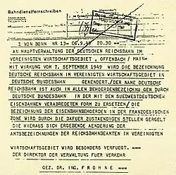 After World War II, each of the military governments of the Allied Occupation Zones in Germany were de facto in charge of the German railways in their respective territories. On 10 October 1946, the railways in the British and American occupation zones formed the Deutsche Reichsbahn im Vereinigten Wirtschaftsgebiet (German Imperial Railway in the united economic area), while on 25 June 1947, the provinces under French occupation formed the Südwestdeutsche Eisenbahn. With the formation of the FRG these successor organisations of the DRG were reunited, a situation codified by the Federal Railways Law (Bundesbahngesetz) that was ratified on 13 December 1951. The railways in the Saarland joined on 1 January 1957.