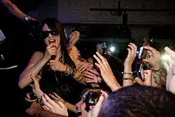 Dev's electro style and "sing-talk" vocal style have been compared to fellow pop singer Kesha.[28] Dev responded to this, saying, "I'm confident enough in what I do that people will see me for who I am ... I get why people compare us but once people see me live they won't connect us as much."[9] While comparing her to Kesha, Idolator wrote that "Dev's beats come off a bit more mellow and her songs a little bit more electro than pop."[28] In response to being compared to both Kesha and Uffie, Dev said, "I just feel that I have a lot more to say and the ability to have an eclectic sound, I'm not bashing either artist, but I'm going to be able to give you a little bit more than what you've heard on those records. When my album comes out, hopefully I won't have to hear another reference or comparison."[5] Much of Dev's music is inspired by rap music, as she believes that fans respond to "pop music but with rap roots". She said, "I've always been into hip-hop. Eminem changed my life when I was younger."[9] The Hollywood Reporter compared her "futuristic" and "pulsing" sound to underground electroclash musicians Peaches and Yelle.[9] Dev's musical genres have been cited as electro-crunk[29] and electropop.[9][28]