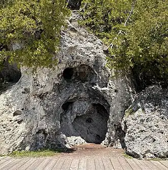 Mackinac Island's brecciated limestone has eroded into a variety of unusual formations. The cave's appearance is comparable to that of a human face with an open mouth.[3]