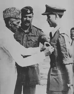 Muhammad Ali Jinnah (left) confers the Military Cross on a soldier for his services in Burma during World War II at Dacca Cantonment, 20 March 1948