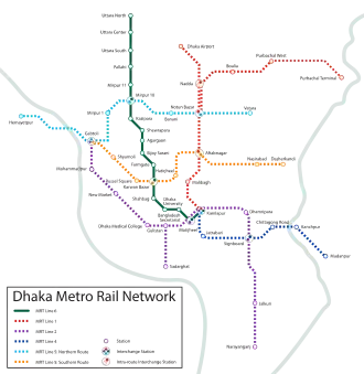 The Dhaka Metro Rail (Bengali: ঢাকা মেট্রোরেল) is a mass rapid transit system serving Dhaka (currently from Uttara North to Motijheel), the capital and largest city of Bangladesh. It is operated by the Dhaka Mass Transit Company Limited (DMTCL).[2] Together with the under construction Dhaka BRT, proposed Dhaka Subway and Dhaka suburban circular rail, it is expected to reduce traffic congestion in the city. The metro rail network's only operational line is the MRT Line 6; additionally, MRT Line 1 and MRT Line 5 are under construction, and MRT Line 2 and MRT Line 4 are in the planning stages. It is part of the Strategic Transport Plan outlined by the Dhaka Transport Coordination Authority (DTCA).[7][8] It has been later reported however that the government may cancel the southern part of MRT Line 5 and most metro rail projects are likely to miss the 2030 deadline.[9]