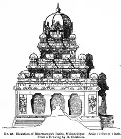 Dharmaraja Ratha is a monument in the Pancha Rathas complex at Mahabalipuram, on the Coromandel Coast of the Bay of Bengal, in the Kancheepuram district of the state of Tamil Nadu, India. It is an example of monolith Indian rock-cut architecture. Dating from the late 7th century, it is attributed to the reign of King Mahendravarman I and his son Narasimhavarman I (630–680 AD; also called Mamalla, or "great warrior") of the Pallava Kingdom. The entire complex is under the auspices of the Archaeological Survey of India (ASI). It is one of the Group of Monuments at Mahabalipuram that were designated as a UNESCO World Heritage Site since 1984.[3]