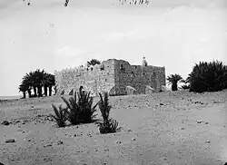 In the early 19th century, John Burckhardt visited Dhat al-Hajj and remarked that it was surrounded by an abundance of fruitless date palms.[3] A formal inspection of the Dhat al-Hajj fort was carried out under the auspices of the Ottoman viceroy of Egypt, Muhammad Ali Pasha.[3] The report noted that the fort was in good condition and contained a cistern that was supplied with water by a spring within the fort's walls and via a canal by a spring located some distance from the fort.[3] Charles Doughty gave the first detailed European description of the fort in the late 19th century, during which he reported that the Hajj had "so much ... diminished from its ancient glory".[4] The Rubillat branch of the Banu Atiya tribe dominated the vicinity of Dhat al-Hajj at that time.[4]