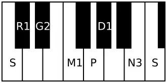 | Avarohanam | Ṡ N₃ D₁ P M₁ G₂ R₁ S |