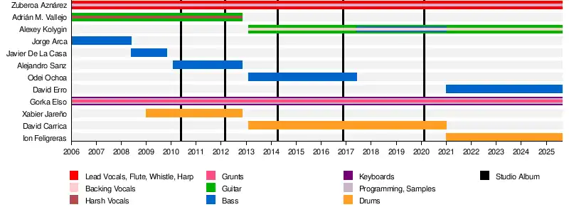 - Zuberoa Aznárez - mezzo-soprano vocals, flute, baroque flute, whistle, harp, programming, samples (2006–present)