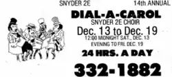 Dial-A-Carol is an annual student-run service at the University of Illinois at Urbana–Champaign in which students take calls from people asking for a Christmas carol. It is run out of Snyder Hall, a residence hall in the Ikenberry Commons on campus. Students and staff volunteer to take calls around the clock for a one-week straight, every year during finals week of every Fall semester.[1] In 2023 Dial-A-Carol completed 60 years of singing on-demand holiday cheer.[2][3] The program has garnered national attention from sources such as ABC News,[4] and Jimmy Kimmel Live.[5] USA Today College wrote that Dial-A-Carol shattered previous records by receiving over 10,000 calls in 2015 for one-week span.[6]