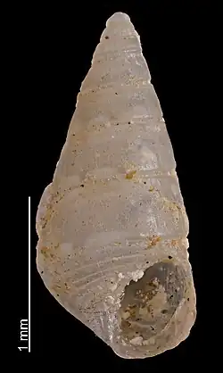The length of the shell attains 2.5 mm, its diameter 1 mm.