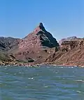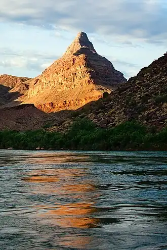 Diamond Peak is a 3,512-foot-elevation (1,070 meter) summit located in the western end of the Grand Canyon, on the Hualapai Indian Reservation in Mohave County of northwestern Arizona, United States.[2][4] This double summit landmark is situated at the mouth of Peach Springs Canyon, where Diamond Creek meets the Colorado River. This peak is an erosional remnant composed of Cambrian Muav Limestone and Mississippian Redwall Limestone.[5] Topographic relief is significant as Diamond Peak towers 2,200 feet above the Colorado River in one-half mile.[6] According to the Köppen climate classification system, Diamond Peak is located in a desert climate zone.[7]