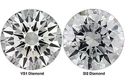 - Very Slightly Included category (VS) diamonds have minor inclusions that are difficult to somewhat easy for a trained grader to see when viewed under 10× magnification.[3] The VS category is divided into two grades; VS1 denotes a higher clarity grade than VS2. Typically the inclusions in VS diamonds are invisible without magnification; however, infrequently some VS2 inclusions may still be visible. An example would be on a large emerald cut diamond which has a small inclusion under the corner of the table.[2]