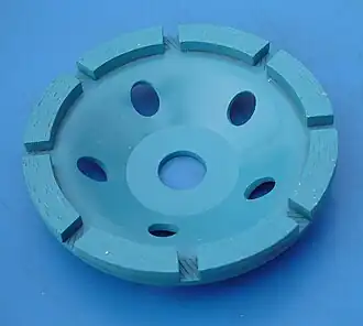 A diamond grinding cup wheel is a metal-bonded diamond tool with diamond segments welded or cold-pressed on a steel (or other metal, such as aluminum) wheel body, which usually looks like a cup. Diamond grinding cup wheels are usually mounted on concrete grinders to grind abrasive building materials like concrete, granite and marble.