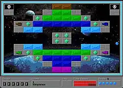 To complete a level, all blocks with diamond symbols must be cleared away by bouncing the ball against them. However, before the diamond blocks can be destroyed, all solid color blocks must be removed by bouncing the ball off each block while the ball matches the color of the particular block. Among the various types of blocks are "brush" blocks, which alter the color of the bouncing ball when it makes contact with them, and skull blocks which cost the player one life.