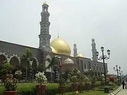 Dian Al-Mahri Mosque, also known as Golden Dome Mosque (Masjid Kubah Emas),[2] is a mosque built on the edge of Raya street, Depok City in West Java, Indonesia. In addition to being a place of daily worship for Muslims, this mosque area attracts many locals and tourists because its domes are made of gold. Because of the vastness of the area and its accessibility to the public, this place is often a holiday destination for family or a place to take a rest.