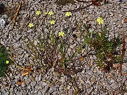 The height of the flowering stalk is about 40 cm, erected and slightly hairy. The leaves are linear-lanceolate in whole edge, length is about 15 mm, and a width of about 2–4 mm. This carnation formed globulous peak cluster (dichasia). The cup is a herbaceous in narrowing the sense that it can be longer. The petals are long about 7 mm, sulphurous-yellow forward improperly serrated. The flowers have the 10 stamens. It blooms in May and June. The fruit is a wiry cylindrical sleeve, which opens with four prongs, but it is more dark seeds.