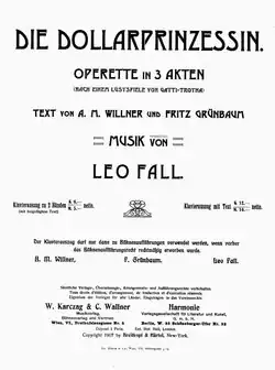 Die Dollarprinzessin is an operetta by Leo Fall. The German libretto was by Alfred Maria Willner and Fritz Grünbaum after the comedy Die Dollarprinzessinen by Emerich von Gatti and Thilo Friedrich Wilhelm von Trotha.[1]