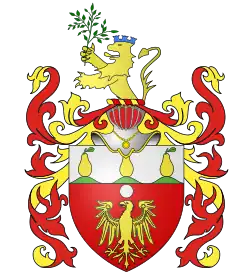 He matriculated his arms: Gules an eagle Or beneath a plate, on a chief Argent three hillocks Vert on each a pear Or slipped Vert. The crest is a demi-lion proper, wearing a castellation Azure on its head and holding a sprig of leaves Vert in its right paw.