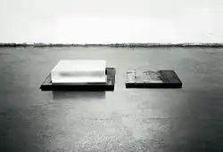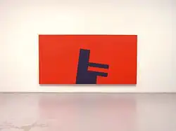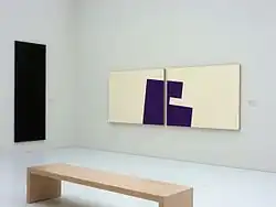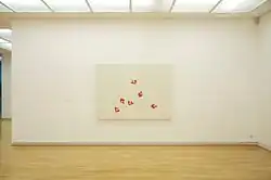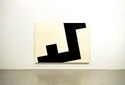 The young Diet Sayler was a great fan of Brâncuși and Malevich. At the start of his career he was above all inspired by Suprematism and Russian Revolution art. He studied the theories and works of the De Stijl and Bauhaus artists. Later he borrowed from Dadaism the principle of chance, on which his own works are based.[6] Sayler arrived at Concrete art by opposing political reality and the doctrine of socialist realism. The drive for change is a central theme in his work.[7] Sayler's early works are highly colorful. In the years of rejection and opposition color disappeared from his work, which became black and white. Following the culture shock of emigration he concentrated on thin lines on white canvases. Towards the end of the 1980s Sayler developed a system of basic elements, which became a repertoire of his painting. Color returned.[8] He produced his ‘Paintings Pieces’, ‘Bivalences’ and ‘Throw Pieces’.[9] The late 1990s saw the creation of wall pieces or ‘Bodies’ and Engrams (‘Norigrammes’) as site-specific installations in the urban architecture.[10] Parallel to this he developed site-specific "Fugues" for the rooms of museums, churches or galleries.