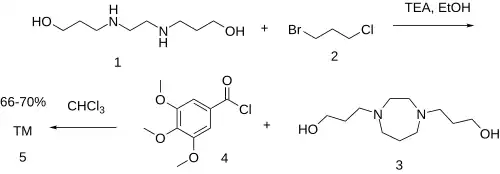 The reaction of bis(3-hydroxypropyl)ethylene diamine (1) with 1-bromo-3-chloropropane (2) gives the homopiperazine derivative 3. Esterification by reaction with 3,4,5-trimethoxybenzoyl chloride (4) completes the synthesis of dilazep (5).[4][5][6]