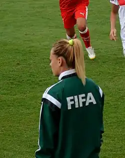 During her school years, she played volleyball. At the age of 17, she assisted with her sister their father in a football match as referee. And one year later, she assisted her later husband in a match.[3]