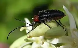Dinoptera collaris can reach a length of 6–9 millimetres (0.24–0.35 in).[3] Elytra are bluish-blackish and rather hairy, with dense puncture. Pronotum is almost spherical, usually orange-red, sometimes dark, with sparse punctuation. Antennae are quite long. The abdomen is orange-red.[4][5]