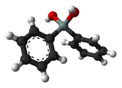 Diphenylsilanediol, Ph2Si(OH)2, is a silanol. The tetrahedral molecule forms hydrogen-bonded columns in the solid state.[4] It can be prepared by hydrolysis of diphenyldichlorosilane Ph2SiCl2. Diphenylsilanediol can act as an anticonvulsant, in a similar way to phenytoin.[4] Although the compound is stable in normal conditions, the presence of basic impurities can accelerate the condensation of the silanol groups.