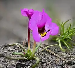 Diplacus angustatus is a petite annual herb growing in ground-level tufts with hair-thin stems barely a centimeter tall. Its herbage is green to reddish in color, the paired linear leaves spreading about 1 to 3 centimeters long. The tubular base of the flower is surrounded by a hairy greenish to red calyx of sepals. The flower corolla is pale to bright pink to reddish-purple with one or more large purple spots, and sometimes yellow markings, in the throat. The trumpet-like corolla may be several centimeters long, much longer than the stem on which it is borne.