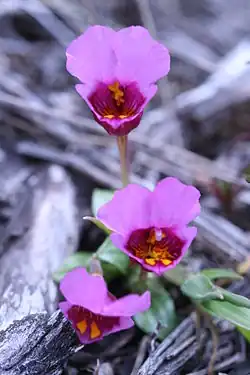Like other monkeyflowers, the flowers are bisexual and bilaterally symmetrical, with fused petals that form a tube-throat.[8] The throat has gold and purple stripes, which form bold mottling. The tube and upper lips are magenta, and the lower lobes are so reduced that they appear absent. The flowers can be open or cleistogamous, staying closed and self-pollinating. The flower is persistent and sits atop a 2 – 4 millimeter pedicel. The calyx is generally green, hairy, and ranges in size from 8 – 14 millimeters, with unequal lobes.[1]