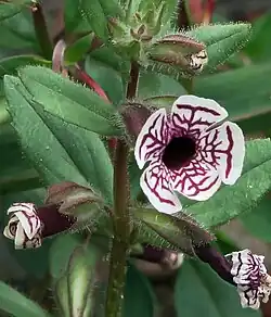The tubular base of the flower is encapsulated in a dark reddish calyx of sepals with uneven lobes. The five-lobed flower has a maroon throat and the circular face is white with bold and intricately patterned purple-brown veining.[7] The bloom period varies from March to May.[7]