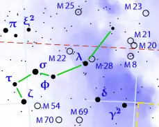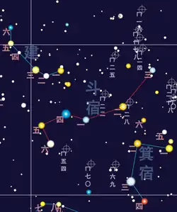The Dipper mansion (斗宿, pinyin: Dǒu Xiù) is one of the Twenty-eight mansions of the Chinese constellations. It is one of the northern mansions of the Black Tortoise.[1] In Taoism, it is known as the "Six Stars of the Southern Dipper" (南斗六星, Nándǒu liù xīng), in contrast to the Big Dipper north to this mansion.