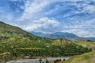 The topography of Upper Dir is dominated by high mountains. The most important mountain range is the Hindu Kush.[12] It runs from north east to south west along the northern borders with Chitral District. In winter whole area remains snow-covered. The mountains in the western part of the district are covered with forests, while the eastern mountain range, Dir Kohistan is barren. Panjkora River is the main river of the district, which originates from Dir Kohistan. Upper Dir headquarters is connected to all tehsil headquarters.[5]