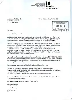 - ^ Lundin, Thomas, Metro, "Ingen chans att se 'Dirty diaries' på bio Archived 2009-09-13 at the Wayback Machine", September 3, 2009; Sköld, Jenny, Statliga medel bakom hårdporr på film Archived 2009-09-05 at the Wayback Machine, September 7, 2009. Retrieved 23 September 2009.