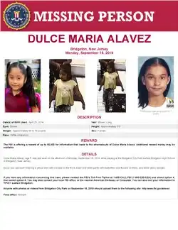 Dulce Maria Alavez (born April 25, 2014 – disappeared September 16, 2019)[1] is an American girl who vanished near Bridgeton City Park in Bridgeton, New Jersey and is believed to have been abducted.[2] A reward has been offered for finding Alavez.[3][4]