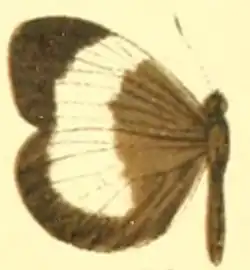The wingspan is about 40 mm (1.6 in).[3] Adults have long narrow almost elliptical forewings and large hindwings. The underside is white, mottled in grey and yellow.[2]