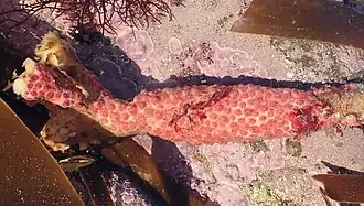 Distomus variolosus is a colonial sea squirt that forms leathery patches, often encircling the stems of kelp. The zooids are globose or ovoid and about 1 cm (0.4 in) high, with the two short siphons close together near the apex. It is difficult to distinguish the buccal siphon from the exhalant siphon. The zooids are separate, but linked by the base or the sides. Zooids with closed siphons have a warty appearance, giving the species its specific name. Generally red, the colonies may be spotted with yellow, brown or pink.[3]