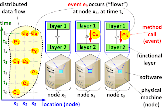 • Concurrent, continuous, and distributed. The flow usually includes all events that flow between the two layers of software, simultaneously at different locations, and over a finite or infinite period of time. Thus, in general, events in a distributed flow are distributed both in space (they occur at different nodes) and in time (they occur at different times). For example, the flow of multicast requests would include all such requests made by instances of the given application on different nodes; normally, such flow would include events that occur on all nodes participating in the given multicast protocol. A flow, in which all events occur at the same node would be considered degenerate.[3][5]