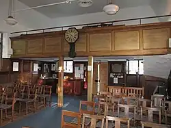 The interior dimensions are 22+1⁄2 by 33+3⁄4 feet (6.9 m × 10.3 m). Its present appearance dates from a reordering in 1877. Across the east end is a panelled timber gallery and a cornice with decorative moulding.[11] There was originally a baptistery (no longer extant) on the south side. The roof is of the king post type.[11] Fixtures include a 17th-century moulded oak Communion table, wooden pews with straight backs in the gallery, and an 18th-century clock which was originally in Southwick General Baptist Chapel in Wiltshire. As well as the graves and monuments in the burial ground, there are memorials in and on the outside walls of the chapel. Michael Marten (d. 1775), his wife (d. 1785) and six children are commemorated on a stone inside, and on the outside of the north wall are memorial stones to Josiah (d. 1802) and Sarah (d. 1813) Dancy and an unknown member (whose mid 18th-century memorial is badly weathered).[11]