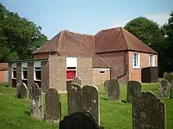 The chapel at Ditchling was situated in a field called Gunsfield. In 1821, most of this land was turned into a graveyard.[2][12] It replaced the original burial ground, which was full by 1760, and a small private plot "scarcely larger than the space covered by a small room" which had been created soon afterwards for the Browne family. This is on the other side of The Twitten from the main graveyard.[21] The oldest headstones in the original part of the burial ground date from 1730 and 1731.[22] In 1815–16, some of the Gunsfield land had been used by Robert Chatfeild junior's sons John and Robert to build a pair of single-sex schools.[12] They were Free Schools, funded by contributions from the chapel congregation and other donations. The boys' school was finished in 1815, and the girls' building was ready the year after. They were initially successful—Thomas Walker Horsfield noted that "at one time half the people of Ditchling were educated there"—but by the 1830s they were struggling financially, partly due to the sudden death of the rector of Westmeston who had been a major financial supporter.[23] Both schools closed in about 1836,[12] when a National School (not associated with the chapel) was opened elsewhere in the village.[24] The cottage of 1672, a timber-framed and wattle and daub building, was extended on its south side in 1808. The new section, taller than the original building, was built of brick and tiles. It housed the Elder of the chapel, who later became the schoolmaster.[11][12]