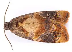 The wingspan is 12–18 mm.[2] The forewings are ferruginous ochreous, blackish-mixed in disc posteriorly. The base and costal fold in the male are dark brown. There is a ferruginous-brown oblique mark from dorsum near the base. The central fascia and costal patch are deep ferruginous, often separated by a whitish suffusion on the costa, and the patch extended as a fascia to the tornus. The hindwings are blackish-grey, in female lighter anteriorly. The larva is greenish-yellowish, with a head and plate of 2 green or light brown.[3]