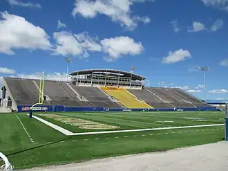 The first game at Dix Stadium was on September 13, 1969, a 24–14 win over the Dayton Flyers in front of 8,172 fans. Because of delays, the new west stands, including the home and visitor locker rooms, press box, and most of the seating, were not completed until after the 1969 football season, limiting the seating capacity to 18,200.[8] For the first season, the teams dressed in the locker rooms at the Memorial Athletic and Convocation Center and were bused to the stadium. At halftime, the teams met in separate public restroom facilities. The "new" Memorial Stadium was dedicated in 1970 and renamed Dix Stadium in honor of longtime Kent State trustee and Record-Courier publisher Robert C. Dix in 1973.[9] Its initial seating capacity was listed at 28,748 before later being revised to 30,520, which stood through the 2001 season.[7]