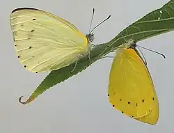 The wingspan is 40–48 mm for males and 40–52 mm for females.[3] The upperside of the wings of males is pure white with a narrow black forewing tip and small black dots on the hindwing margin.[1] The underside is whitish with two rows of black spots on the hindwings,[1] with the inner row sometimes absent or incomplete. The female has several colour forms,[1] but is usually pale yellowish white on the upper surface with heavier black markings than the male,[1] and has a dark spot on each forewing. There is a rare female form (luteola[3]) where the upperside is orange yellow[1] or deep apricot.[3] The underside of females is similar to the male but the rows of black dots are more pronounced and the base colour is pale to bright yellow. Another rare form (rubrobasalis) has orange suffusion at the base of the underside of the forewing[1] and a creamy-yellow upperside.[3] The dry-season form (alba[3]) has reduced black markings.[1] A distinguishing feature of D. pigea is that the hindwing costal has a yellow streak, unlike other Dixeia species.[3]