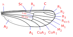 Dixidae are small (body length not more than 5.0 mm) slender gnats with thin legs. Adults are black to yellowish-brown.[4] The head is relatively broad. The antennae are thin and the flagellum has 14 segments. The proboscis is short and thick and the palpi are five-segmented. The thorax is slightly convex. The wing veins are without scales (with scales in the closely related family Culicidae). The subcosta is fused with the costa at the level of the base of Rs or slightly proximal to this. The wing venation exhibits radial, medial, and cubital forks (R 4 branched, M 2 branched, Cu 2 branched). R 2+ 3 is strongly arched, the r–m crossvein is distinct, and the discal cell is absent. The anal vein of the wing is long. The genitalia of the male is inverted at 180° by torsion of segments 5–8.