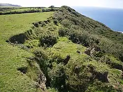 Dizzard is between the Atlantic Ocean to the north, the valley and cove of Crackington Haven to the west and the Millook woods and valley to the east. There are five named farms or (former farms); Dizzard Farm, East Dizzard, Higher Dizzard, Old Dizzard and West Dizzard. Surrounding Dizzard Point are the stunted oaks of the Dizzard Woodland.[1] There are a number of designations for the Dizzard cliffs, including part of the Widemouth to Crackington Geological Conservation Review site, within the Boscastle to Widemouth SSSI, and the Pentire Point to Widemouth, Area of Outstanding Natural Beauty (AONB) and Heritage Coast.[3]