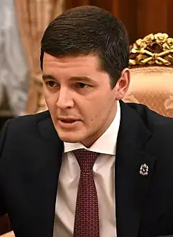 Dmitry Andreevich Artyukhov (Russian: Дмитрий Андреевич Артюхов; born 7 February 1988) is a Russian politician who has served as the Governor of Yamalo-Nenets Autonomous Okrug since 29 May 2018.[1] As of May 2018, he is the youngest head of a federal subject in Russia. In 2021, Artyukhov 's official income was 26,409,000 rubles. His wife owned 15,076,000 rubles.[2]