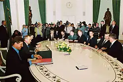 In 1999, along with other St. Petersburg city officials, he joined the government of Vladimir Putin. He was Chief of Staff from 1999 to 2000. Dmitry Kozak became deputy head of the presidential administration and remained in this position under various titles until 2004.[14] In 2003, he briefly entered international politics and unsuccessfully attempted to solve the conflict between Transnistria and Moldova (see Kozak memorandum).[15][16][17]