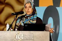 Shabina Khatri, founder of Doha News, giving a presentation on her experience with blogging.