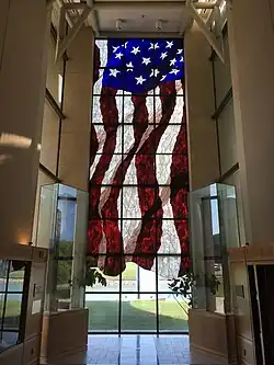 - The Old Glory in Stained Glass is a 29-foot (8.8 m) stained-glass American flag. It is believed to be the largest stained-glass flag in the world.[15][16] The display is a gift from University of Kansas alumni Forrest and Sally Hoglund.