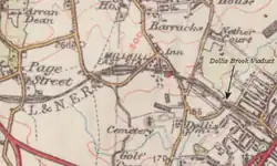 The viaduct was designed by John Fowler and Walter Brydone, chief engineer for the Great Northern Railway (GNR) from 1855 to 1861.[2] The contractor that built the bridge was Smith, Knight & Co. The viaduct came into use on 22 August 1867 with the opening of the GNR's single-track Edgware, Highgate and London Railway line from Finsbury Park to Edgware, via Finchley and Mill Hill, which was authorised by an Act of Parliament in 1862.[3]