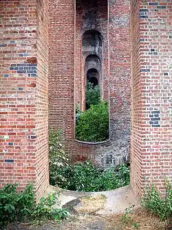 The viaduct's 13 segmental arches carry it across the valley of the Dollis Brook, and over Dollis Road.[3][5] Each arch spans 32 feet (9.8 m) at the springer level, and is based on tapered piers. In each pier there is an opening with an arched soffit and a dished invert.[3] The viaduct is made from brick.[3] It is the highest point on both the Northern line and the highest point on the London Underground above ground level, reaching nearly 60 feet (18 m). It is not, however, the highest altitude on the Underground system, which is near Amersham (Metropolitan line) in the Chiltern Hills, at 150 metres (490 ft) above sea level.[6]