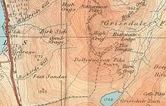 The spelling ‘Dollywaggon’ is used on Ordnance Survey 1:25,000 maps but ‘Dollywagon’ on 1:50,000 maps. The Ordnance Survey gazetteer, nominally based on the 1:50,000 maps, lists only ‘Dollywaggon Pike’. As of 2005, the ‘Dollywagon’ spelling is slightly more common in online references. Alfred Wainwright used ‘Dollywaggon Pike’ in his Pictorial Guide, a position supported by other writers.[1][2] One meaning for the word Dollywaggon gives an Old Norse source formed by the combination of dolgr (‘fiend’ or ‘giant’) and veginn (‘lifted’).[3]